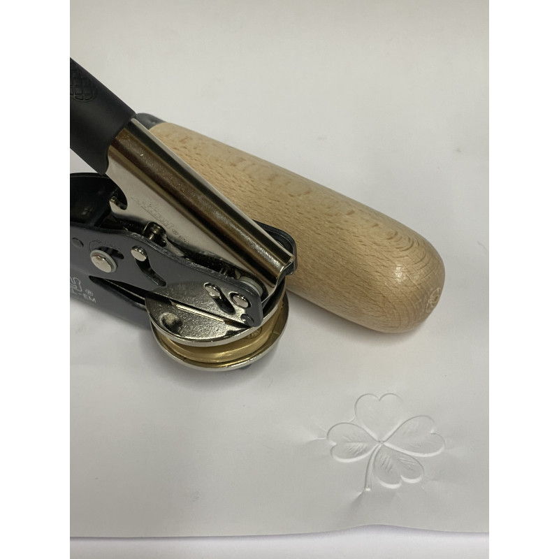 Cette pince à gaufrer, ou timbre à sec,  est fabriquée à la demande du client, elle est unique. La gravure est faite à l’aide d’une fraise au carbure de tungstène conique tournant à 39000 t/m, dont l’extrémité est mesurée au microscope, la précision est au 2/100 de mm. L’importance du relief permet par la suite une bonne lisibilité.