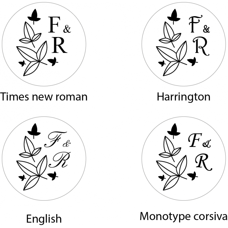 Gravure de 1, 2 ou 3 initiales en police "English", "Harrington", "Monotipe corsiva" ou "Times"