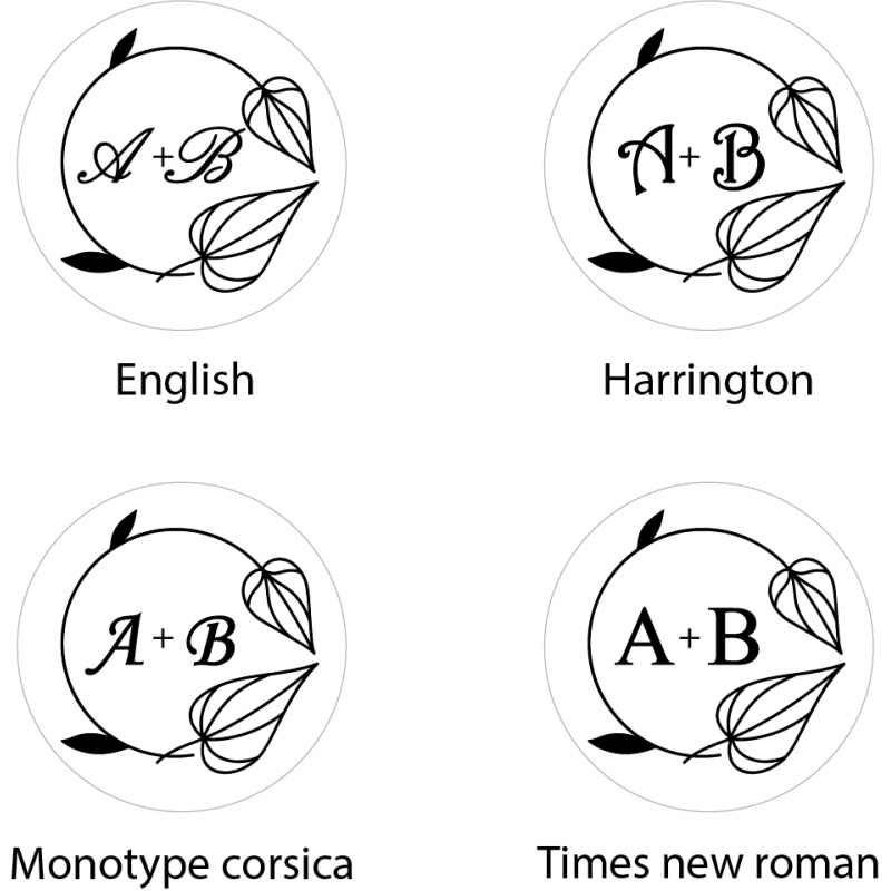 Gravure de 1, 2 ou 3 initiales en police "English", "Harrington", "Monotipe corsiva" ou "Times"